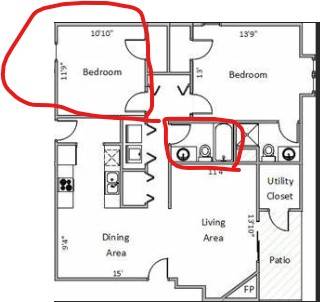 *A bedroom that measures about 12' x 11' or something like that. Yep, your very own private room. Bonus! Wait, there's more! The apartment happens to have two bathrooms so you would have your own bathroom as well. No need to worry about unflushed toilets, random hairs all over the toilet seat (unless you do this yourself), or accidentally walking in on your roommate when they are butt-ass naked from just stepping out of the shower. But since it would be your bathroom anyway, I won't judge if you don't flush or leave hairs all over the seat. **This is the bedroom closest to the living room as I will be occupying the master bedroom and paying a higher portion of the rent - see the bedroom/bathroom circled in red on the included floor plan (ignore the door in the pantry area - that doesn't exist since this is a 2nd floor unit)**