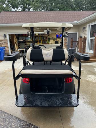 Lithium battery upgrade with less than 20 hours on it, rear seat kit with cup holders, LED headlight, taillight, blinker kit, horn, mild lift, larger wheels with brand new tires, new seat covers, new MCOR, speed turned up to medium setting, extra steering wheel and seat cover (blue?).
