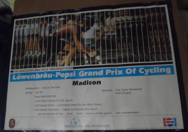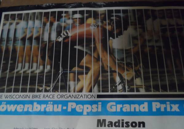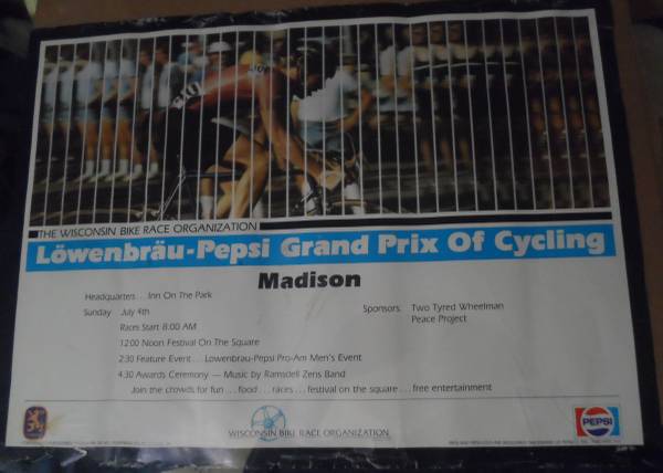 BIKE POSTER: A 1982 Lowenbrau-Pepsi Grand Prix of Cycling poster advertising the Criterium held on the Capitol Square, Madison, Wisconsin on July 4, 1982. Poster has been rolled up and shows wear with some wrinkles, small tears, edge damage, etc.. Size: 23 x 17 inches. Own a piece of Wisconsin Bike Race History.