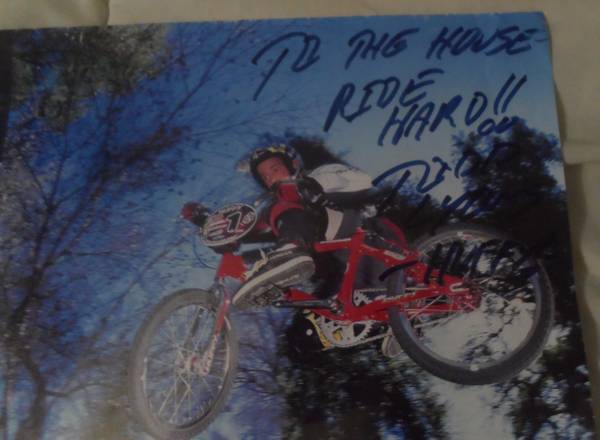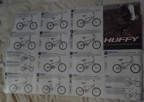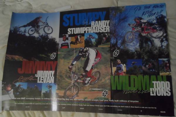 BIKE POSTER: A two sided poster on glossy paper of the 1998 Huffy Bike Pro BMX Team Riders and on the reverse is the 1998 line of Huffy BMX bikes. Poster signed by Todd Lyons, one of the three Huffy Pro BMX Team Members. Size: 31x20 inch.