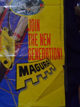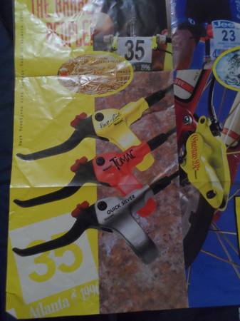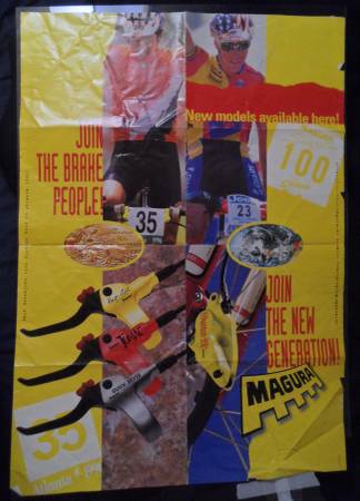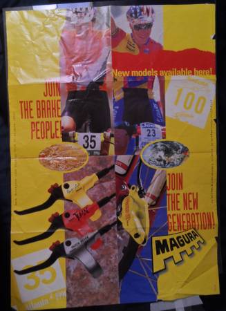 BIKE POSTER: An glossy paper poster advertising MAGURA Brakes. Celebrating Bart Brentjens 1996 Olympic Gold in Atlanta. Folded three times. Overall Size: 24 by 33 inch. Good condition with wrinkles and a few minor edge issues.