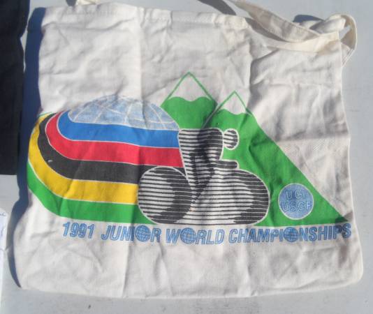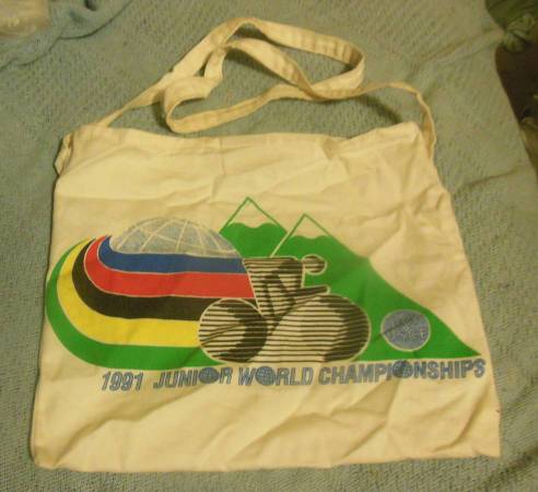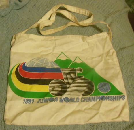 =A white 1991 Junior World Championships bag. Race took place in Colorado Springs, CO, USA. On the Garden of Gods Circuit. Road Race won by Jeff Evenshine, USA. NEW, $30.
