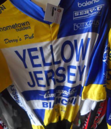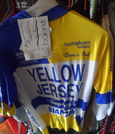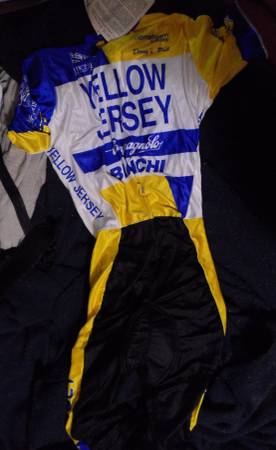 Skinsuit: Yellow Jersey/Campagnolo/Bianchi front/back, Yellow Jersey/TTW on shorts. Various other sponsors. Standard one piece jersey/shorts, full zip front, elastic 1” leg bands, Boleno Brand, Size Men L, Made of Lycra and nylon. Full synthetic chamois. $30.