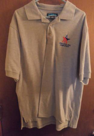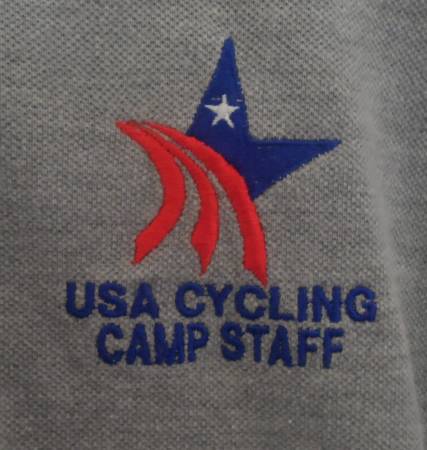 USA CYCLING CAMP STAFF POLO: A polo shirt with “USA CYCLING CAMP STAFF” and logo embroidered on the upper left chest. Brand: Tri-Mountain Size: Men Large Color: Gray Material 60% cotton 40% polyester, three button neck. New, never worn.