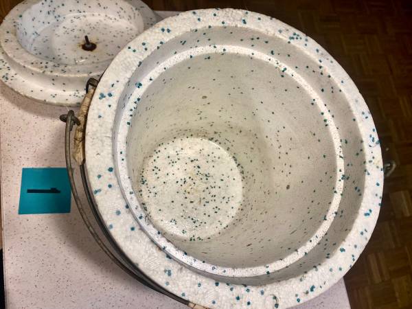 This is a very nice bucket, No Cracked, No Holes, Chain is Attached, Nice Wire Metal Cage.