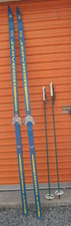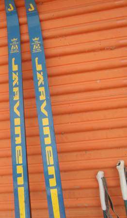 XC SKIS: A pair of JARVINEN Cross Country Skis. 126 Olympic 187 FIS Medals. Noglassu Made in Finland. Blue with yellow trim. 2”/51mm wide, 83”/210.8 cm long. TRAK aluminum 3 pin medium bindings, right binding missing cage. Wax skis.