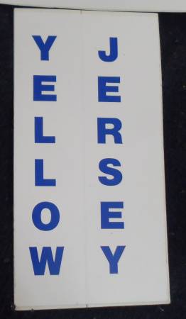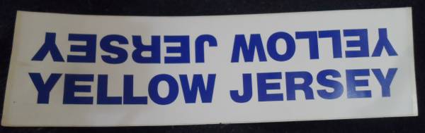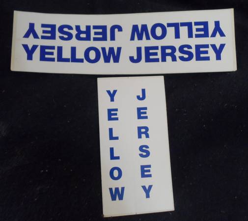 STICKERS: YELLOW JERSEY stickers. Use on bike forks, frame, disc wheels, tool boxes, vehicles, or any other place you may wish to use them. Heavy Vinyl, Size: 12x3.5 inch and 7x3.5 inch. Have several in each size.