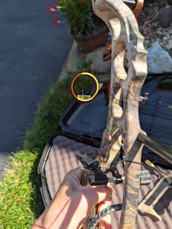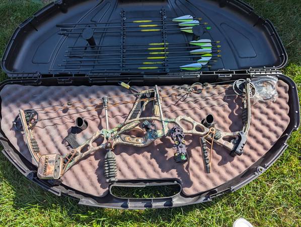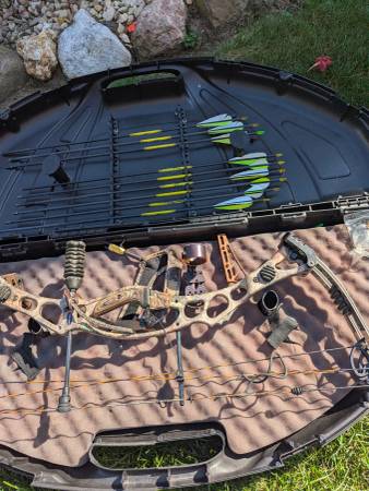 Used Hoyt compound bow comes with everything you need to get out hunting. Right handed bow 60 to 70 lbs draw weight