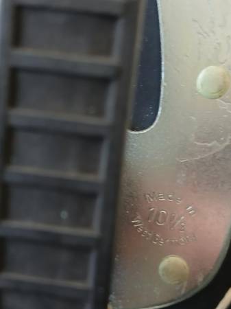 Vintage black figure skates with blade covers. Made in West Germany. No size markings except on blade where it says 10 1/3. My guess is that they are probably a size 10 for women. Mens equivalent 9ish? I could measure length in inches if that would be helpful to someone who is interested.