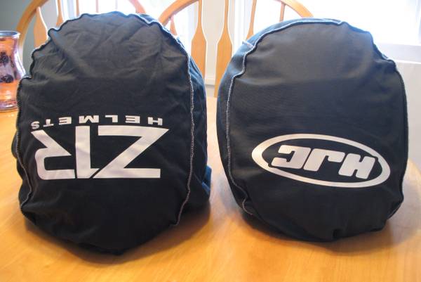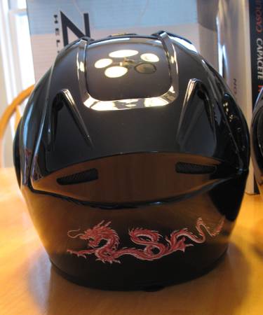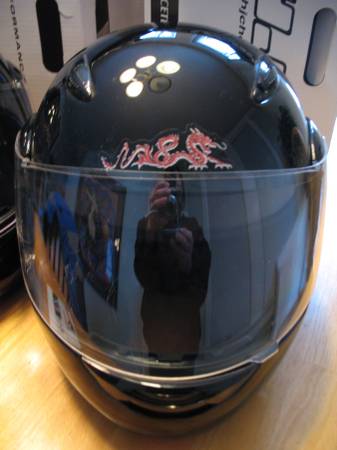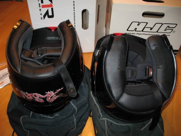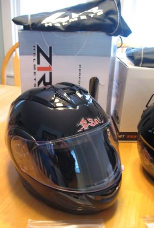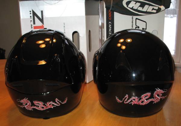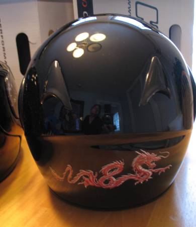These are modular helmets that flip up and have adjustable opening face shields as well. The helmets are Gloss Black with a Red Chinese Dragon stencil on the front and back. Both helmets are DOT approved, come with a drawstring storage bag and have owner’s manuals. Neither has been dropped and they have very minimal scratches.