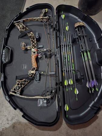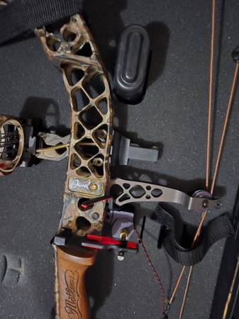 Mathews Jewel Compound Bow with case, quiver, arrows, field tips, broadheads, lighted pins, peep site, kisser, and release. 25.5 draw length.