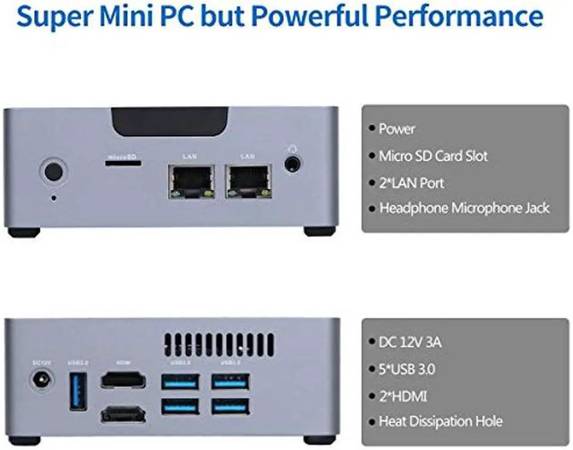 Mini PC Intel Celeron Quad Core 6GB DDR4, 128 GB SATA SSD, Mini Desktop Computer, Windows 11, Dual Gigabit Ethernet NIC, Micro SD-Card (max 256 GB), Dual HDMI, 5X USB3.0, 4K UHD, Bluetooth