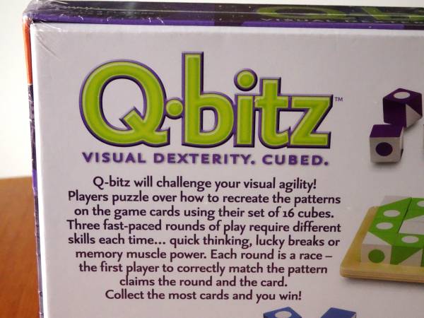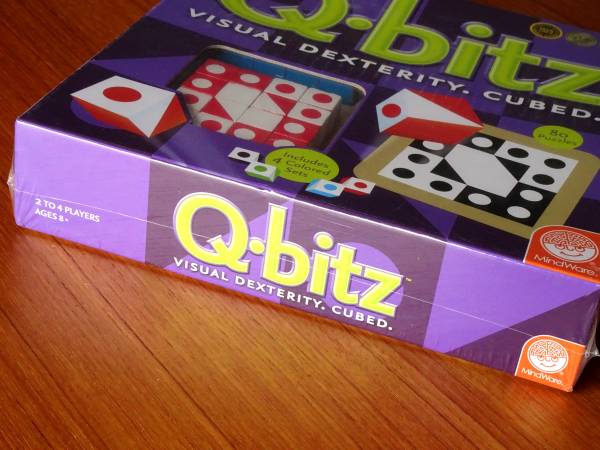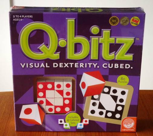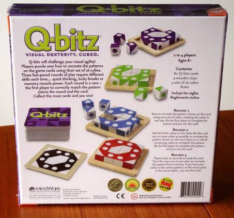 This listings is for a Brand New, Sealed Q-BITZ Game by MindWare. MindWare is the maker of "Brainy Toys for Kids of All Ages". This game has received awards. It is for 2-4 players, ages 8 and up. The box describes the game on the back and lists the contents as 80-Q-Bitz Cards, 4- Wooden Trays, 4- Sets of 16 Cubes and the Rules. Please see all of the pictures showing the sealed box in perfect condition and descriptions of the game and awards.