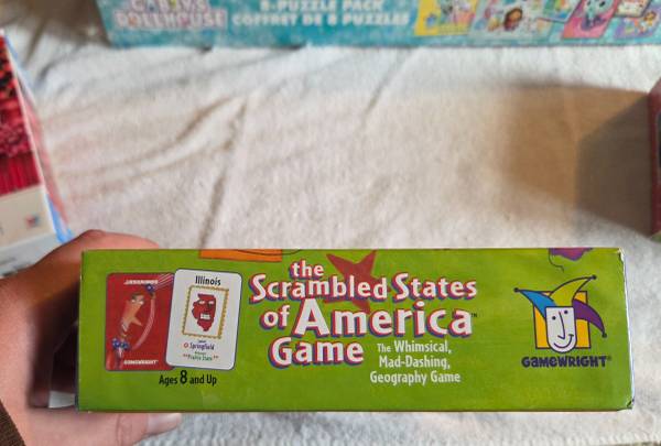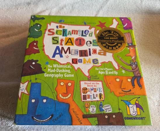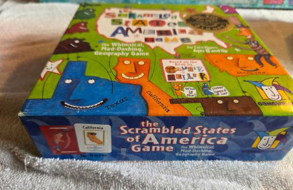 1 game, Gamewright's the Scrambled States of America. This is for ages 8 and up and it's for 2 to 4 players. It's a mad dash geography game and it's the winner of the Dr. Toy 100 Best Children's products.