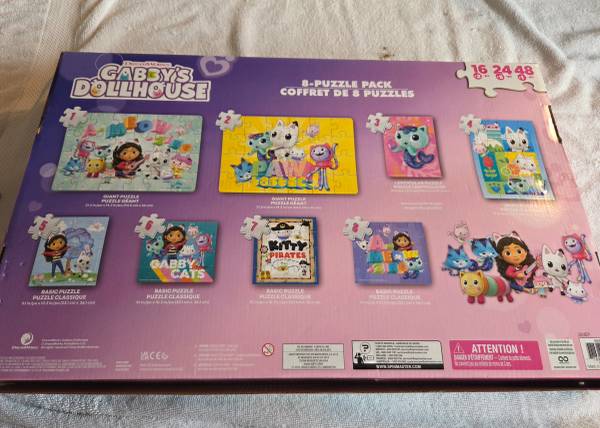 1 DreamWorks Gabby's Doll House 8 Piece puzzle pack. The puzzles range from 16, 24, to 48 pieces. Ages 4 plus, not for child under 3 years.