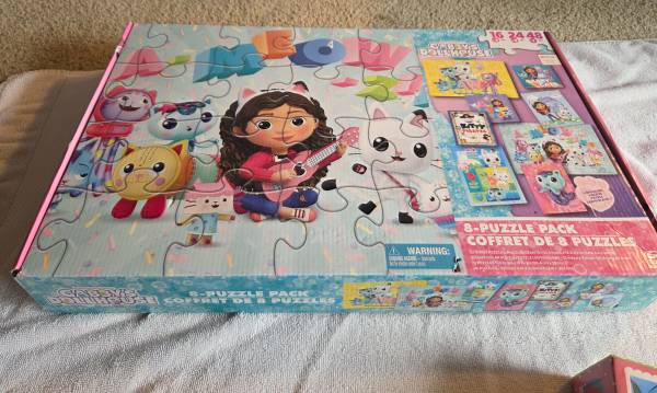 3 of the 4 items are new, they have never been opened. The large Gabby puzzle box has been opened and 1 puzzle set is gone but the other 7 never been opened.