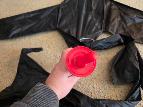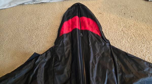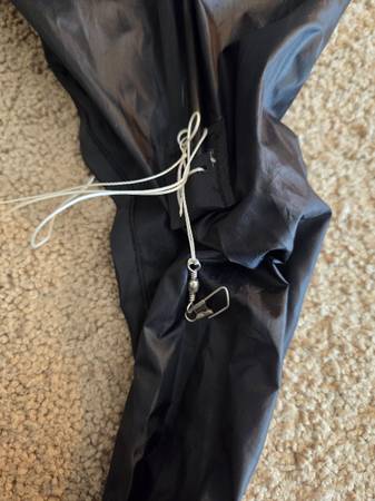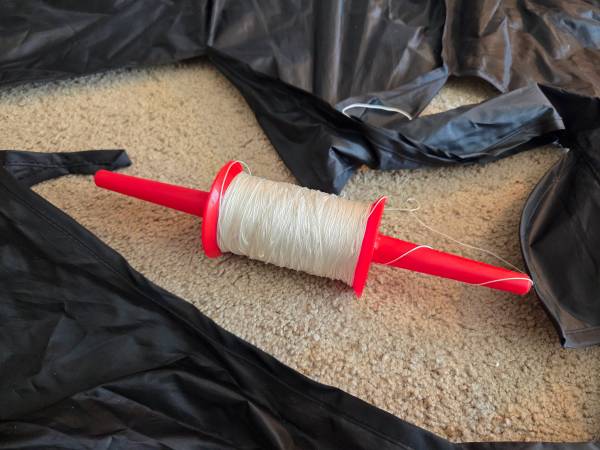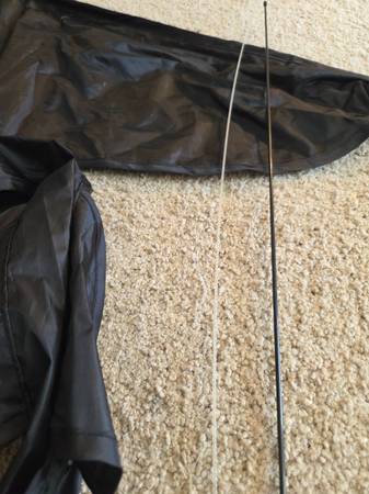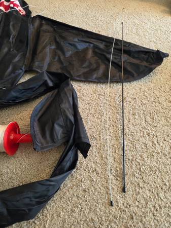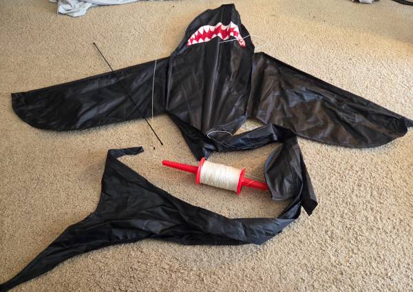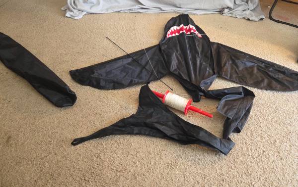 Very gently used and in excellent condition. There are no holes, tears or rips. It's a black shark with a red mouth and white teeth. It has long fins and a long tail, very cool kite. It has a tick durable red plastic reel with a lit of white string to fly the kite up high.it comes with all poles, 2 are removable so that it can be stored easily. It also comes with a black fabric bag for storing. It's 83" long x 53" long.