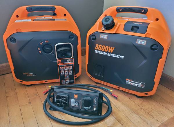 I have two (2) brand new Wen 56360iX 3600 watt inverter generators for sale with a parallel kit. These generators are brand new in the box and comes with the owner's manual, a funnel and a tool kit. These inverter generators come with a 50 amp parallel kit and are extremely quiet.
