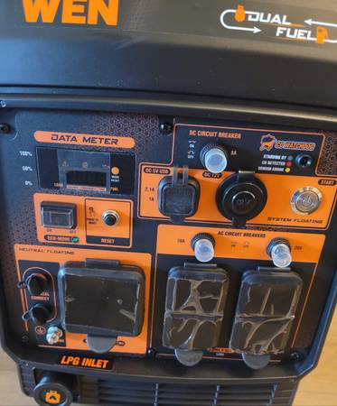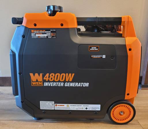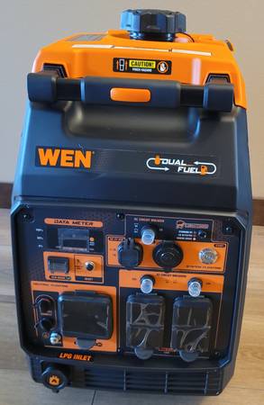 I have for sale, one Wen DF480ix 4800-watt inverter generator with electric start. This generator is new in the box with factory packaging and have never had gas or oil in it. The wheels and pull-out handle make this unit very easy to move. It runs on both gasoline and propane, and comes with a manual, tool kit, oil, propane hose and regulator.