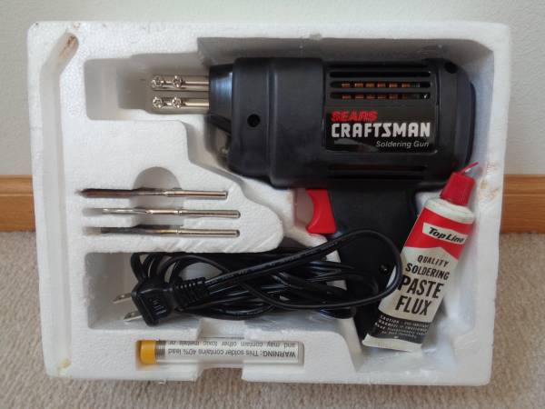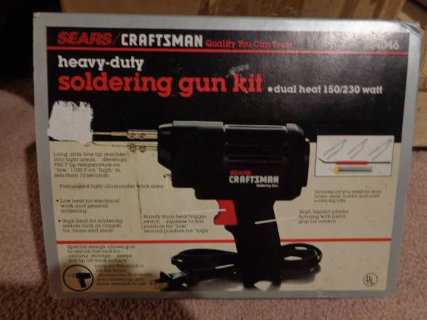 Sears Craftsman heavy duty soldering gun kit for sale. Dual heat 150/230 watts. Has a duel heat trigger switch. Sqeeze to first position for "Low" heat, second position for "High" heat. Asking $50.