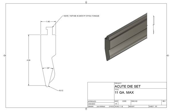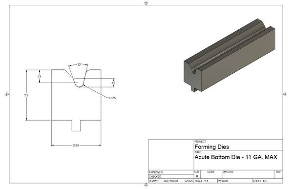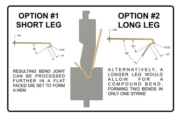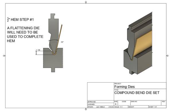 This hemming die set can forms sheet metal, recommended gauge 13-12 gauge. 11 Gauge max capacity. Engineer setting up can decide between two different forming options. Options #1 - Short Leg...