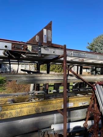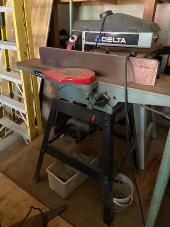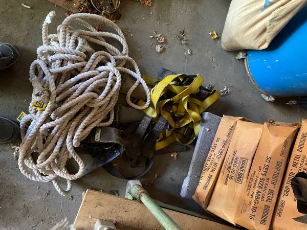 stretch planks, lathe, welder, cement shutes,drum sander and vacuum, routers, nail guns, hand tools, rigid generator, 6” jointer, biscuit cutter, space heaters, multiple ladders, ladder jack, roof...