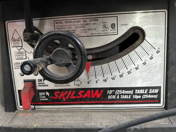 Skilsaw 10” table saw with adjustable miter up to 45°. Model 3400. If this ad is up it’s still available.