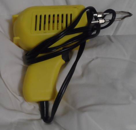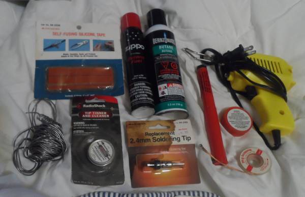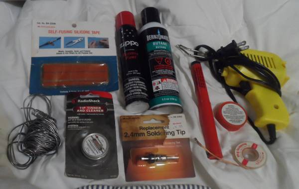 Kit consists of: A corded Solder Gun model BD-96A, an Archer Brand butane powered solder torch with extra tip, two partial full cans of butane, desolder wire, flux, tip tinner and cleaner, self-sealing silicone tape, and a bunch of solder. Bonus, a vintage Radio Shack Construction Hints to building electronic kits.