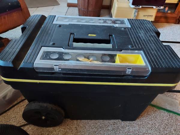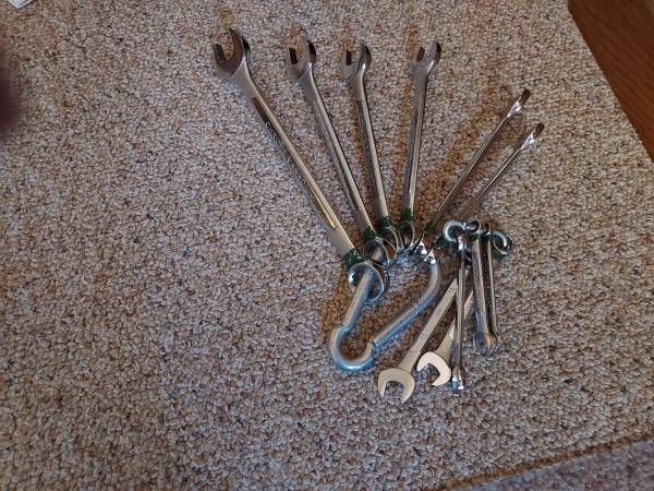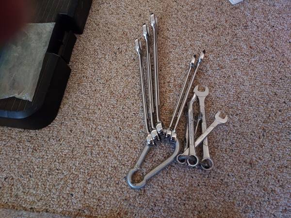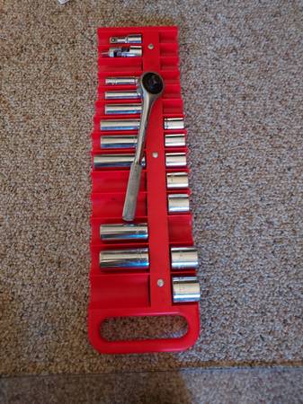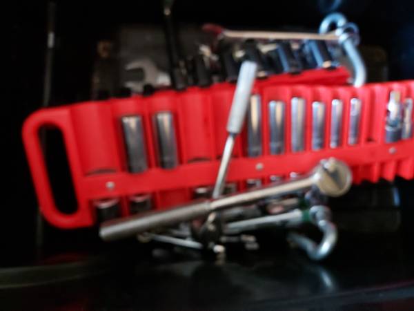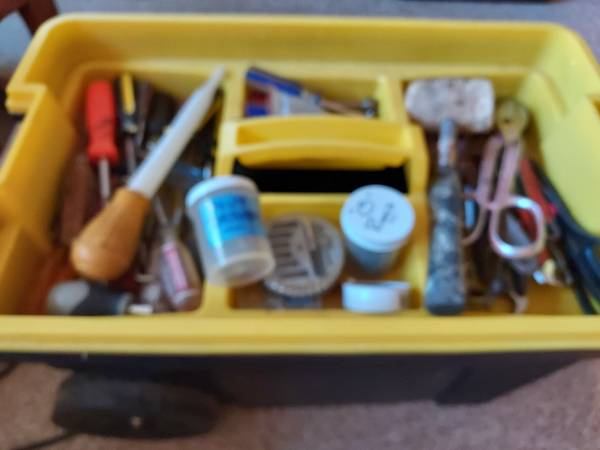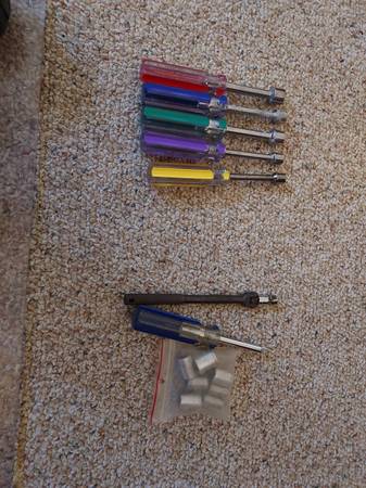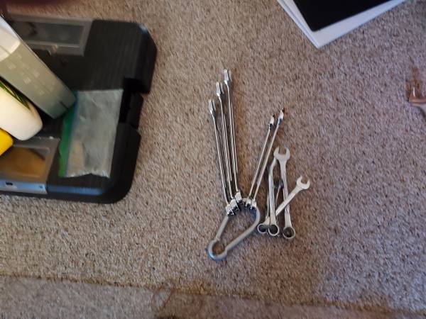 For sale is a Stanley portable tool box and miscellaneous tools. The tools include combination wrenches both SAE and metric, nut drivers both SAE and metric, socket set in case both 3/8" and 1/4" drive, 1/2" sockets and ratchet and 3/8" sockets and ratchet, miscellaneous screw drivers and pliers. Plus other handy tools.