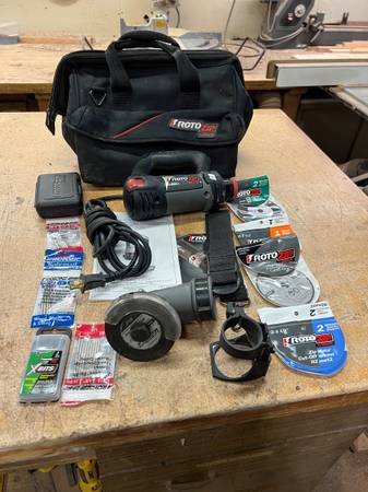 Rotozip cutting tool. It has the angle attachment and a wide variety of bits and disks for grinding and cutting, most are new. $60
