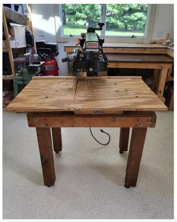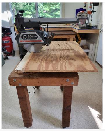 10" radial arm table saw on stand. Cuts accurately on either cross cut or rip settings. Combines table saw and mitre saw into one tool.