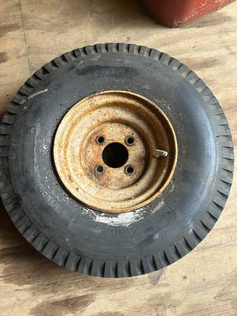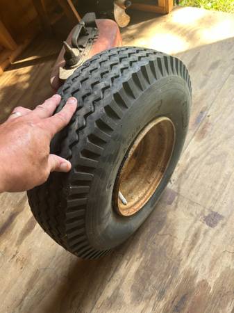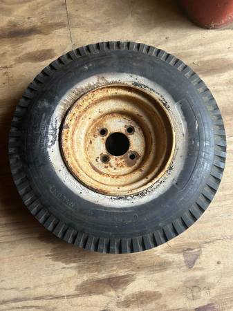6.90/6.00-9 4 bolt. Excellent tire tread and has held air for years, stored inside