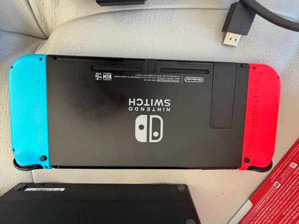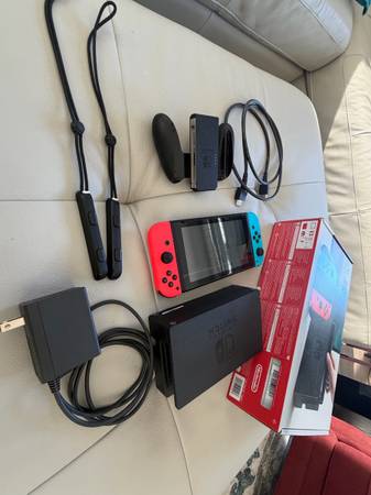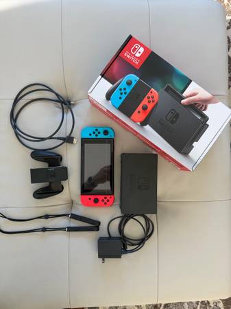 I’m selling a Nintendo Switch (not OLED) with the original box and all accessories. Console works perfectly. Screen protector has a smear, but the screen protector can be removed if you want. Dock, HDMI cable, power brick, red+blue joycons, joycon wrist loops, and joycon control grip, and box are included.