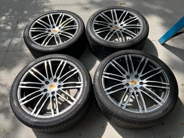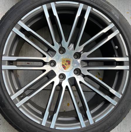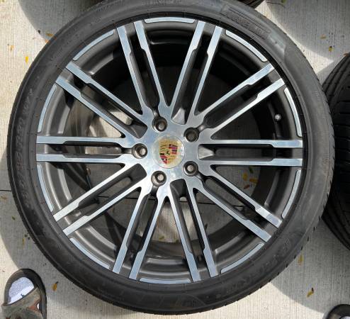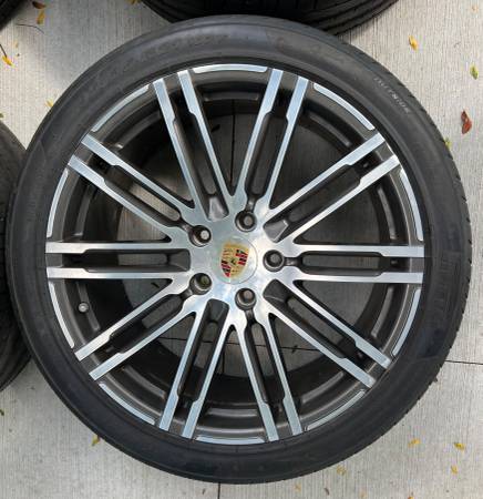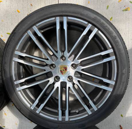 Porsche original equipment 21” alloy rims in excellent condition. Lug bolt pattern is 5x130mm. Tires and rims responsibly stored in an environmental climate-controlled facility. One tire repair plug (photo). Averaged tire tread depth between 4/32’ - 5/32”. 10JX21 rim size. Porsche part number: 7P56011025AE. These tires were mounted on a 2016 Cayenne.