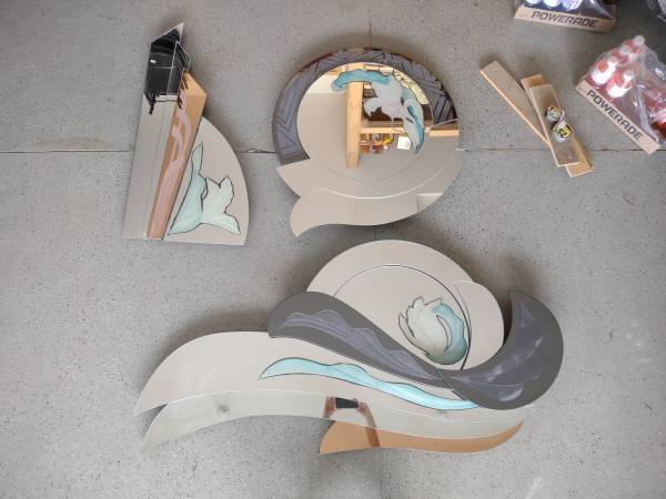Large mirror: 64" x 32" Smaller round mirror: 36" x 36" Odd shaped mirror: 44" x 20" There is a second round mirror of similar size that may be available. Text: (six zero eight) 513-nine two six six...